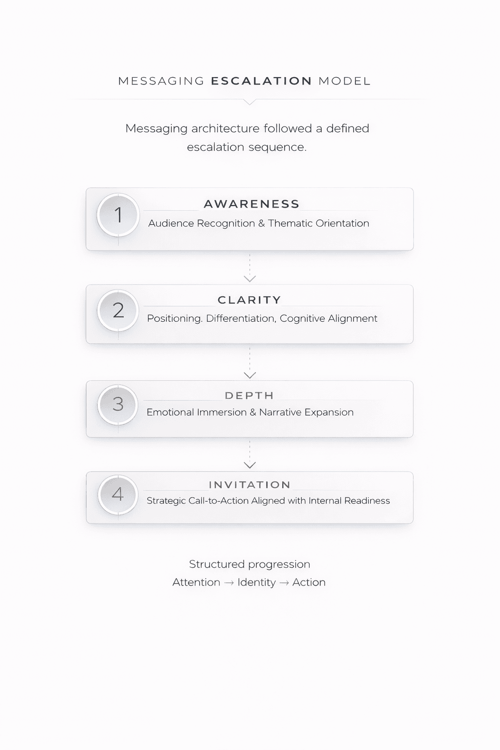 The diagram illustrates how narrative progression was structured to move users from orientation to deeper identity alignment before presenting invitation-based calls to action.